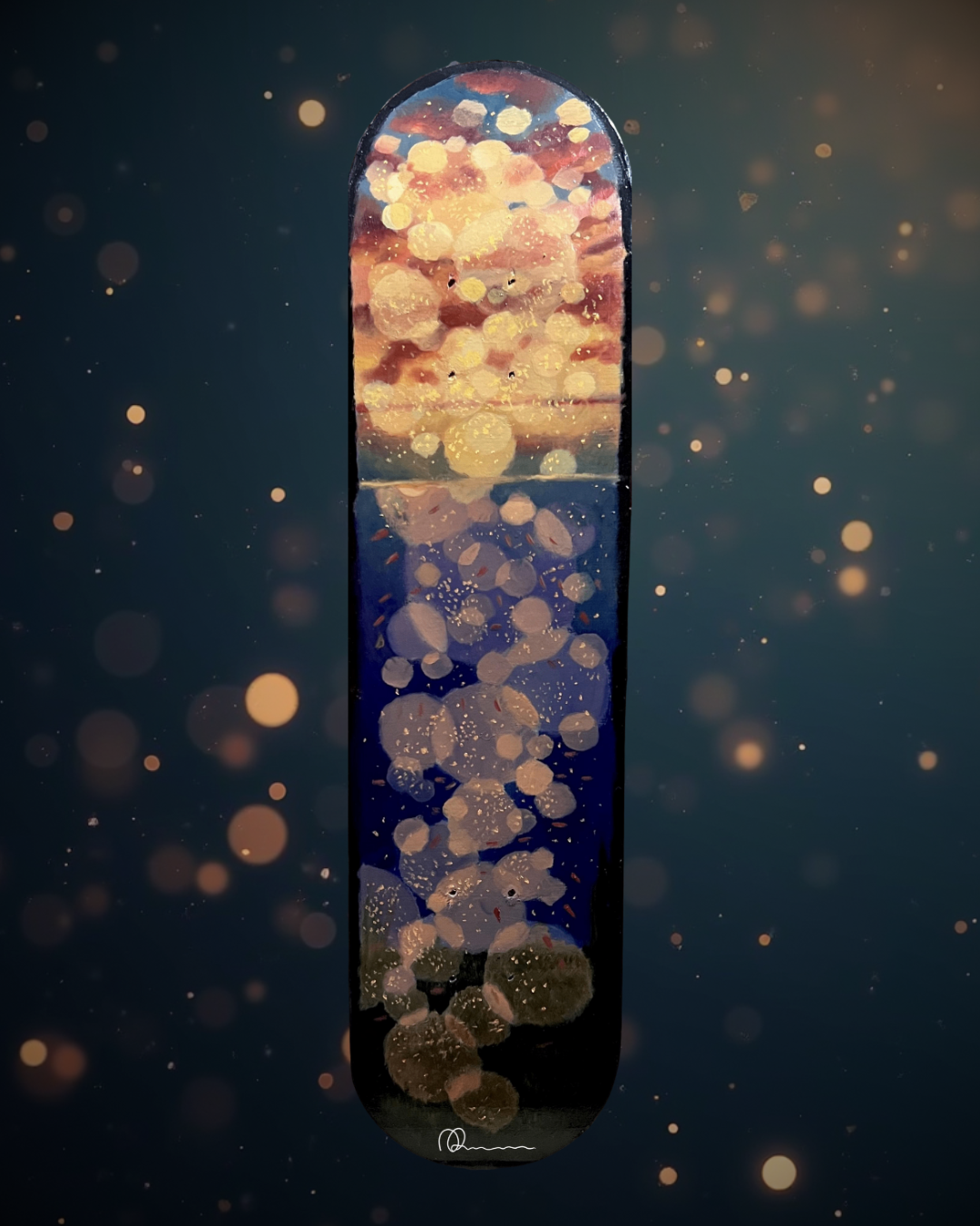 Horizons of the Soul is a series of hand-painted seascapes on skateboards that capture the subtle emotional shifts we experience during moments of change. Each painting reflects a different part of that internal tide. Calm, tension, nostalgia, renewal, set against the endless horizon of the sea. Rather than offering dramatic statements, the works sit with the uncertainty and quiet reflection that often come with personal transitions.